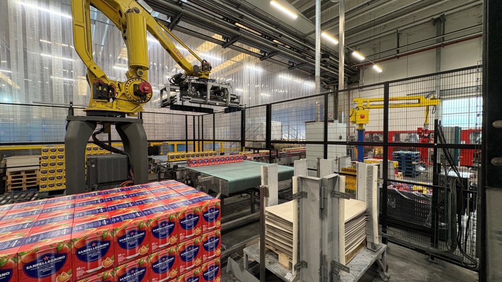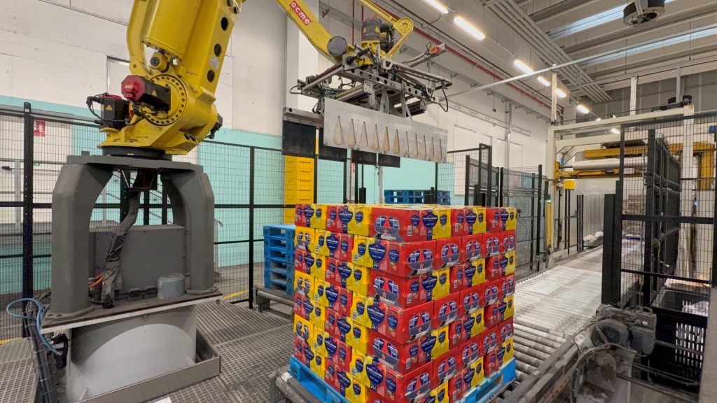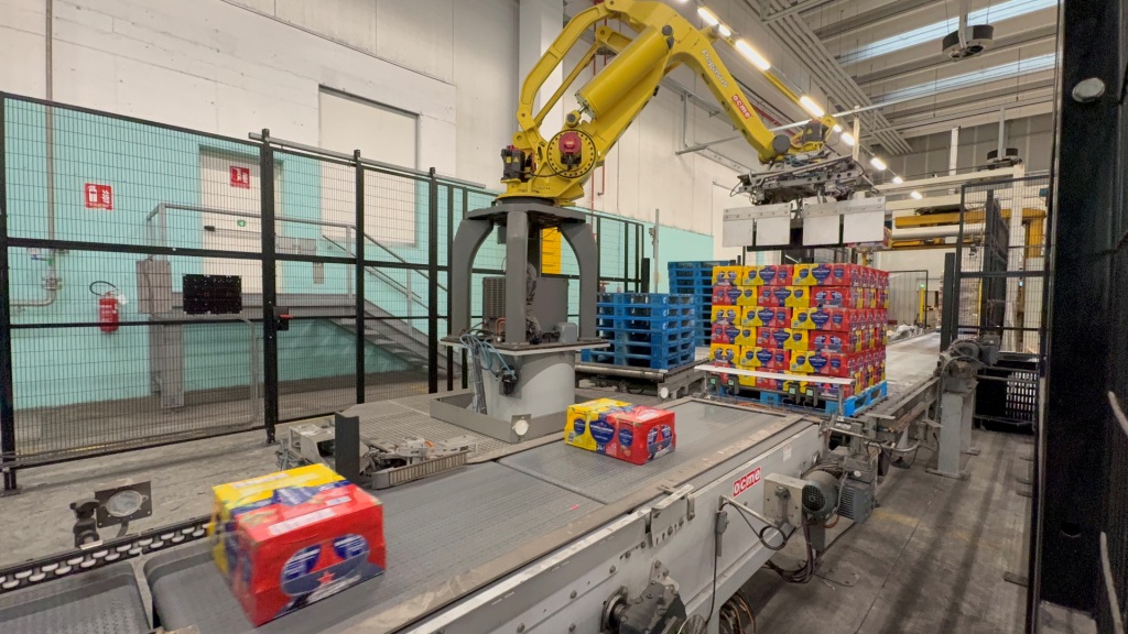 Downstream of packaging, the OCME PEGASUS palletizer precisely handles the new multi-flavor packs. Its robust structure and Siemens PLC control ensure smooth movements, positioning accuracy, and reduced cycle times, even with different formats.