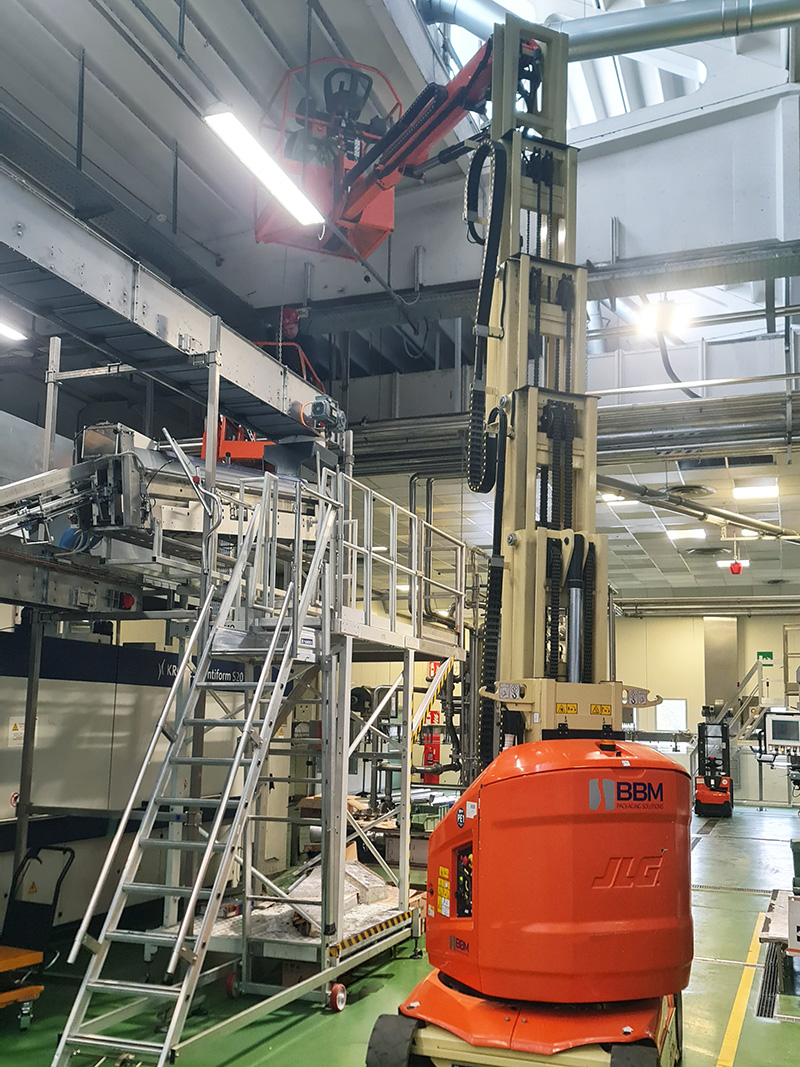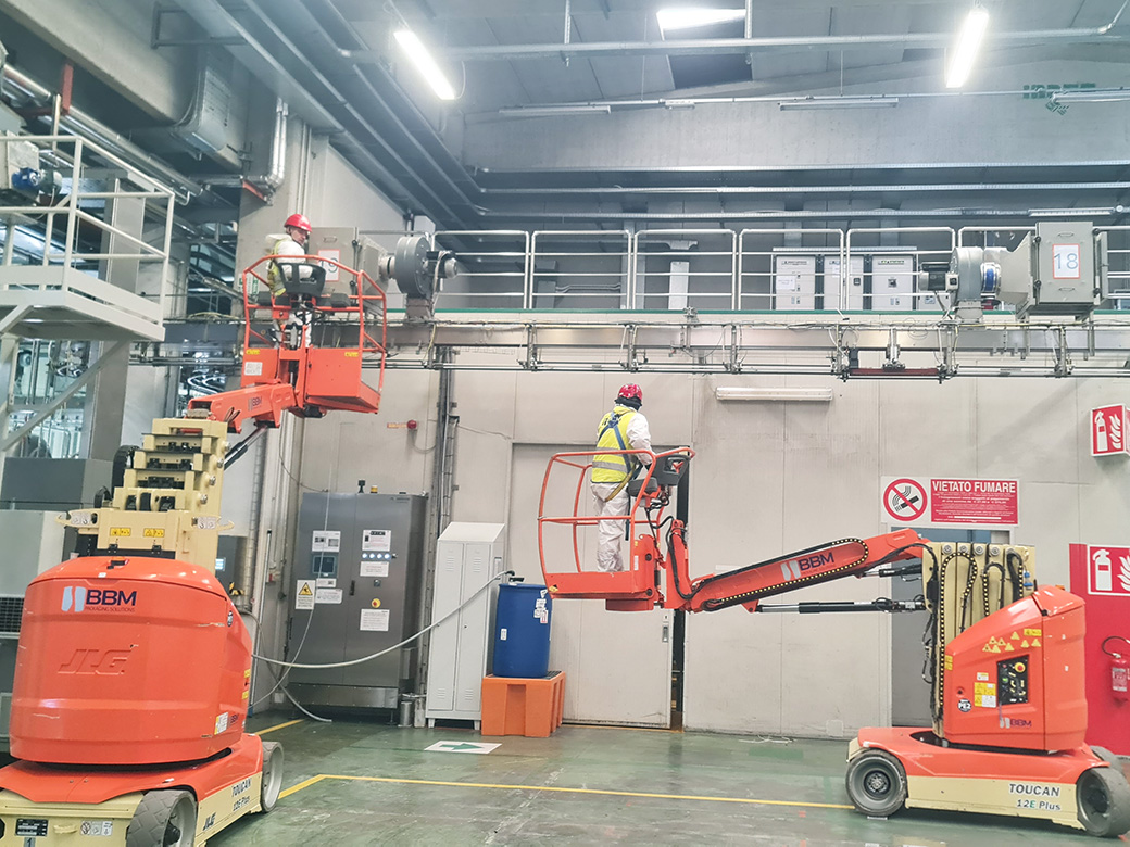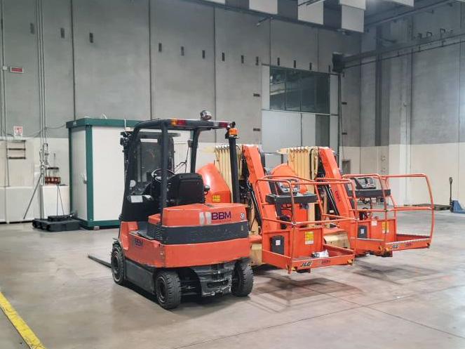 Among the handling equipment provided by BBM are electric scissor lift platforms PE1 and PE2, accordion-style and therefore articulated, with non-marking tires, capable of lifting people and loads up to 200 kg, reaching a maximum height of 10 meters and a boom extension up to 5 meters.