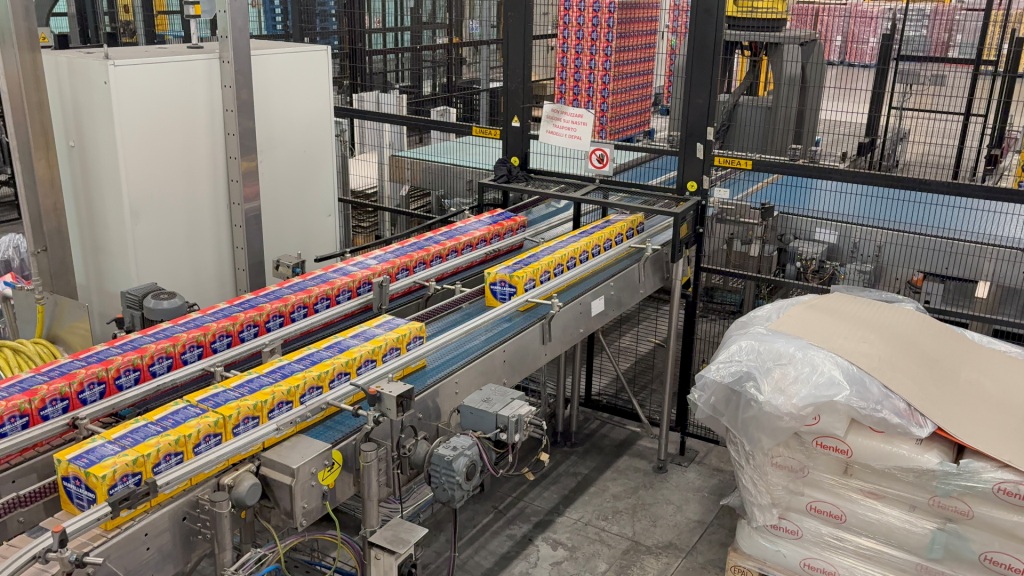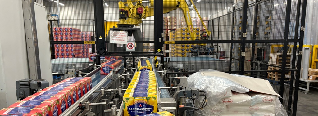 OCME Pegasus Depalletizer, a high-performance robotic solution for depalletizing operations dedicated to wrap-around boxes. Pegasus allows the depalletization of pallets containing bottles or cans, safely transferring layers of product onto the production line.