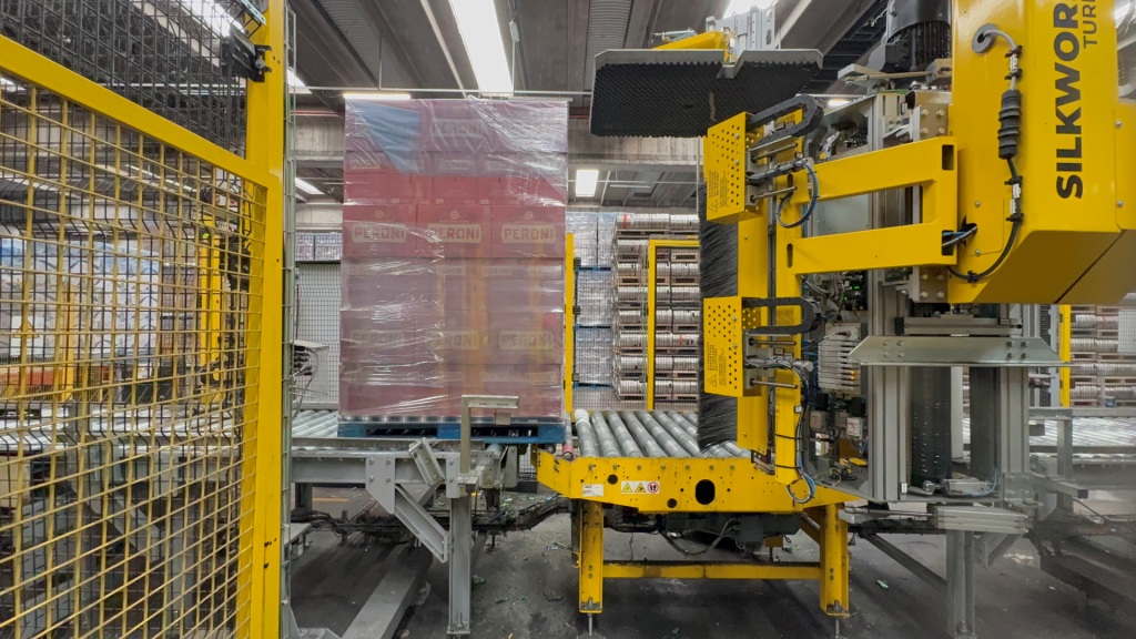The Bema stretch wrapper (2010) is a wrapping machine that applies stretch film around pallets of boxes, crates, or bottle packs, ensuring load stability and protection during transport.