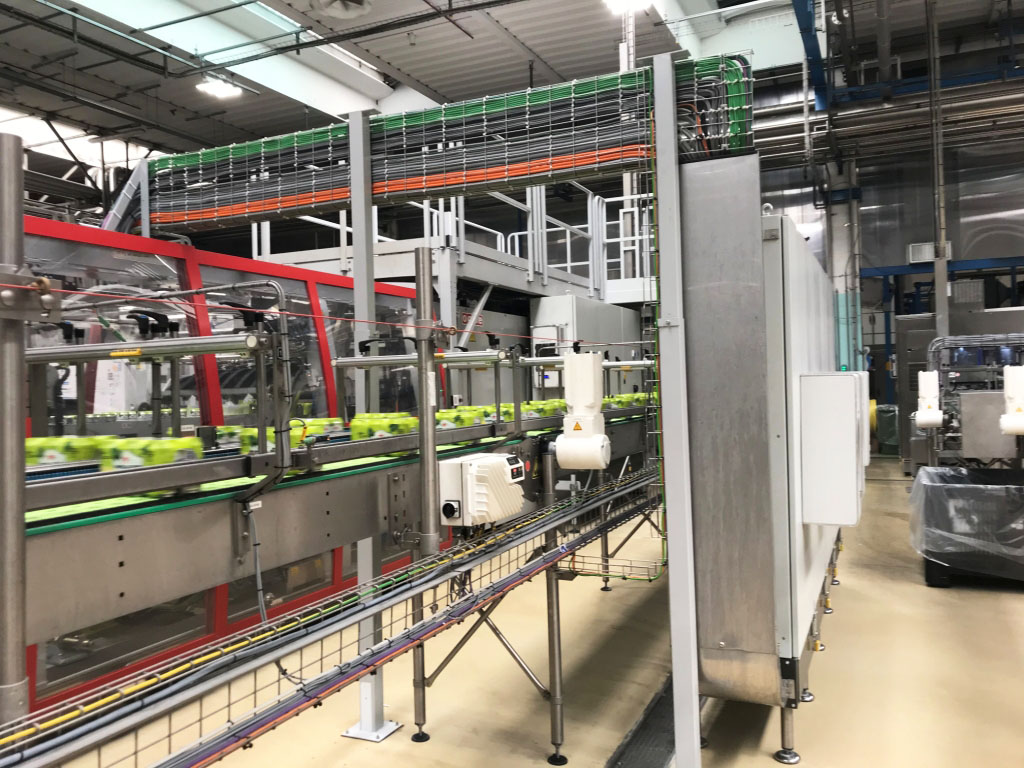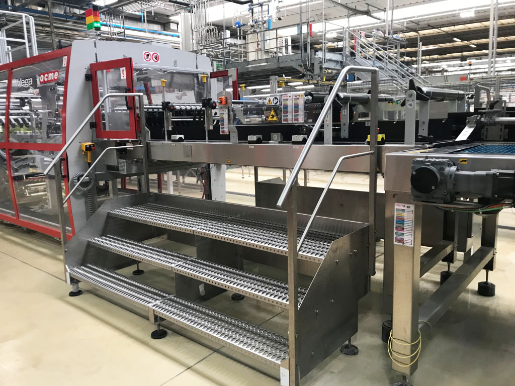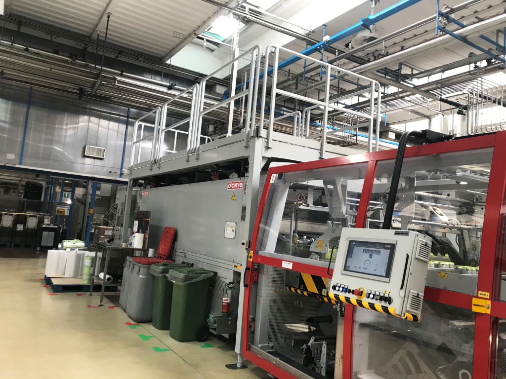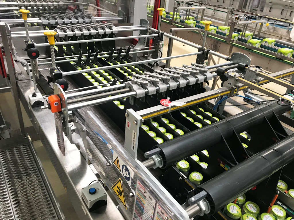 Enfajadora OCME VEGA HT 100/2, con una capacidad de producción de hasta 72.000 BPH. La velocidad indicada en botellas por hora se refiere al formato estándar de 1.500 ml en configuración 3x2.