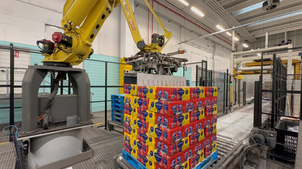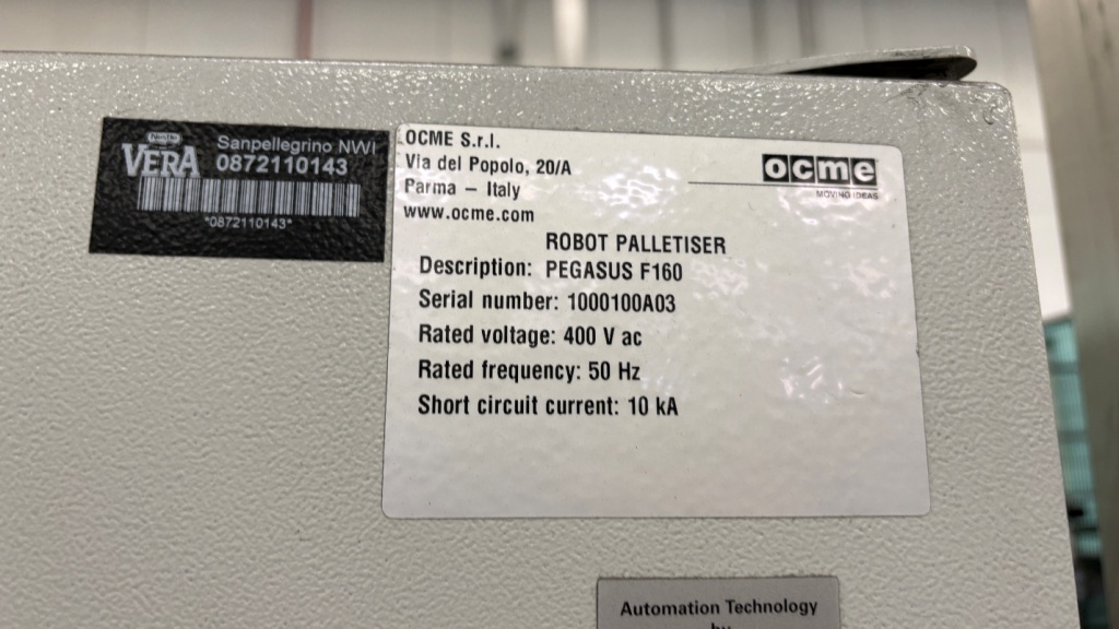 Paletizador OCME Pegasus F160 del 2004, ideal para la formación de palets de paquetes envueltos que contienen botellas. La máquina permite apilar de forma precisa y segura cajas o paquetes sobre palets con dimensiones de 800x1200 mm, optimizando los flujos de final de línea y garantizando una alta estabilidad de la carga.
